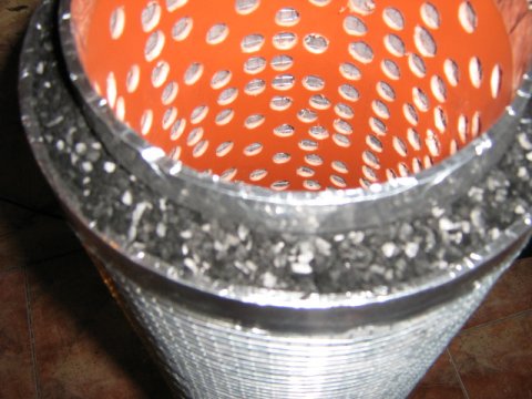 - Des trous d'un diamètre de 5 à 7 mm sont percés dans les parois d'un tuyau large (sur toute la surface). De même, sur la surface d'une pièce plus étroite, des trous sont pratiqués avec une taille de 12 à 14 mm.