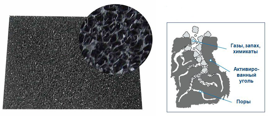 - Le flux d'air pénètre à travers un diffuseur dense imprégné d'une solution de charbon ou contenant du charbon actif. Une partie de la saleté s'accumule dans le tissu.