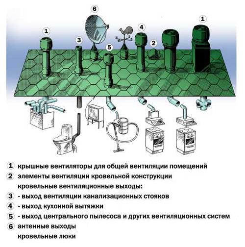 Prenons cette situation à titre d'exemple : selon le plan de reconstruction d'un immeuble résidentiel, la toiture doit être remplacée. A travers la nouvelle toiture, il est nécessaire de retirer les hottes des chambres, de la salle de bain, le conduit de ventilation du sous-sol et la hotte de la cuisine. La question se pose, que se passera-t-il si vous ne faites pas quatre passes, mais rassemblez tous les canaux et mettez un seul tuyau de ventilation sur le toit ?