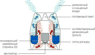 L'appareil climatique est de la conception la plus simple. Il se compose d'un corps, d'un réservoir et d'un bac avec de l'eau, d'un bloc flotteur et d'une cartouche ou d'un élément remplaçable en matériau hygroscopique. Les appareils fonctionnent sur le principe de l'humidification naturelle de l'air. Un ventilateur intégré souffle de l'air à travers la cartouche humidifiée. Simultanément à la saturation en eau, l'air est débarrassé des particules de poussière.