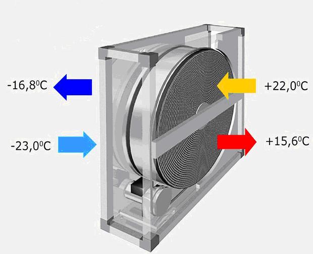 - Récupérateur rotatif. L'échange d'énergie est plus rapide que dans la forme précédente, tandis que les flux apportés et prélevés sont partiellement mélangés. L'efficacité est égale aux valeurs du dispositif à plaques croisées.