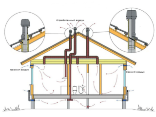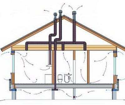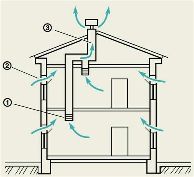 Si la maison a un poêle ou une cheminée, la cheminée peut être utilisée comme ventilation. Le système de climatisation doit être fait sans erreurs. Si le bâtiment comporte plusieurs étages, une ventilation est prévue à tous les niveaux. Si les trous sont situés trop haut ou trop bas, l'échange d'air devient plus lent.