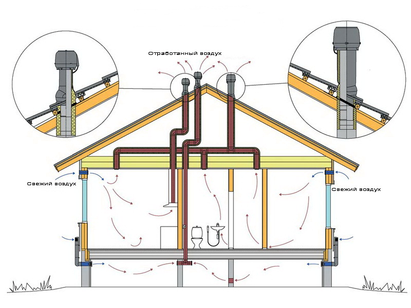 Vous avez besoin d'un tirage normal dans le système de conduit d'évacuation. Ils commencent dans les chambres, puis ils vont au grenier, au grenier ou au toit. L'air évacué est évacué à l'extérieur par les conduits. Le frais entre par les fenêtres ouvertes, les portes, les pores des murs.