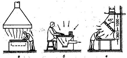 La méthode de localisation des sécrétions nocives à l'aide d'abris couvrant la source est très efficace. Mais le procédé technologique ne permet pas toujours l'utilisation d'un tel principe de fonctionnement de la ventilation aspirante. Autres dispositifs de ventilation par aspiration localisée :