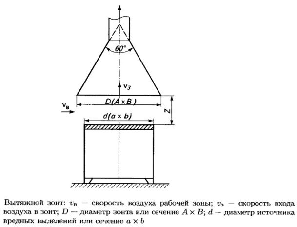 Pour éviter la formation de zones de stagnation sur les bords du dispositif de capture, l'angle d'ouverture doit être inférieur à 60 degrés. Dans les pièces très basses, il est permis d'augmenter l'angle d'ouverture jusqu'à 90 degrés. La hauteur du bord inférieur du parapluie ne doit pas dépasser 180 cm au-dessus du sol.Si la vitesse de l'air dans la pièce est supérieure à 0,4 m / s, le parapluie est équipé de rideaux pliants qui coupent le flux d'air pollué sur trois côtés. Les calculs ci-dessus vous aideront à sélectionner l'équipement à l'avance et à déterminer le prix. Mais pour calculer en détail la ventilation par aspiration, vous devez contacter un spécialiste.