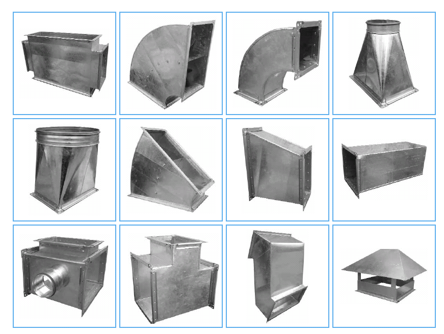 Les pièces façonnées sont produites dans une grande variété de types et de formes. Souvent, les principaux coûts d'installation de la ventilation ne concernent pas les conduits d'air, mais les raccords. Ils peuvent être rectangulaires ou circulaires, de différents diamètres et sont choisis pour les conduits d'air.