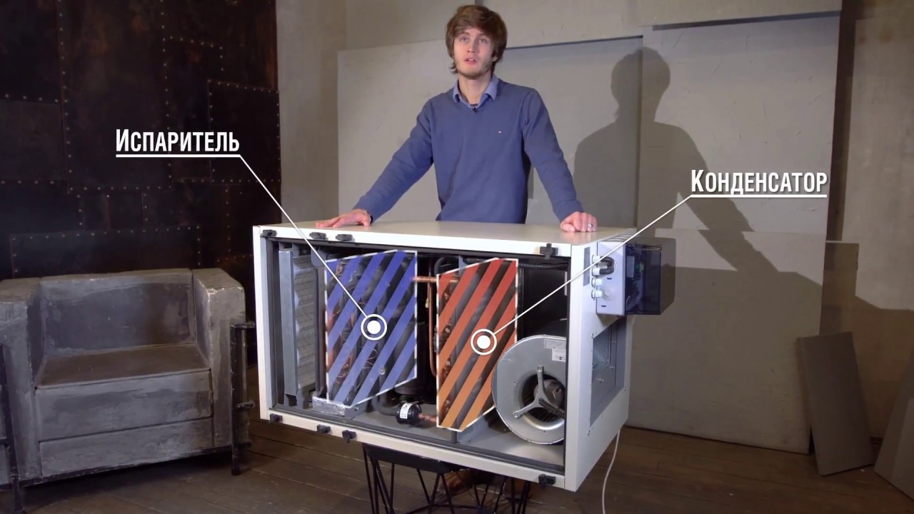 La déshumidification se produit par un processus de condensation physique. L'excès d'humidité dans l'air pénètre dans la surface refroidie, dont la température doit être inférieure au point de rosée. Les masses d'air traversent deux échangeurs de chaleur remplis de fréon ou d'une autre substance à l'aide d'un ventilateur.