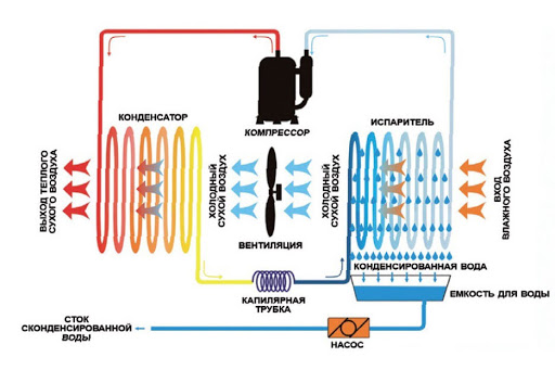 Le fréon est automatiquement refroidi lorsqu'il traverse le tube capillaire sous pression. Après cela, il va aux échangeurs et les refroidit. L'air de la pièce dégage un excès d'humidité lors de son passage dans le premier échangeur de chaleur, ce qui libère de la condensation. Le fréon, qui se trouve dans le premier échangeur de chaleur et a dégagé une masse d'air froid, s'évapore. Lors de cette réaction, il pénètre dans le compresseur et passe dans le deuxième échangeur. Ensuite, le fréon est condensé à l'aide d'air froid, à la suite du processus d'assimilation, les masses d'air sont réchauffées.