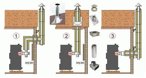 La deuxième option est préférable - en chauffant de la fumée, le tuyau se transforme en une sorte d'échangeur de chaleur, qui chauffe en outre l'espace. Le premier type de conception prévoit la sortie de l'élément vers l'extérieur au niveau du poêle. Sa partie verticale est fixée sur la rue au mur. Cette option est la plus sûre en termes d'incendie.