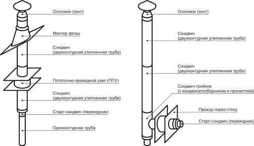 Les plus modernes et les plus durables sont les éléments de cheminée en tuyaux sandwich, constitués de trois couches, ou en céramique. Ils sont assemblés à partir de pièces d'usine prêtes à l'emploi, dont un large assortiment permet de créer rapidement un design avec les paramètres souhaités. Les pièces principales de ces tuyaux sont des pièces droites ou pivotantes, des tés, des éléments de collecte des condensats, des adaptateurs, des déflecteurs et des pièces coniques. Les tuyaux sandwich sont constitués de deux couches de tôles entre lesquelles est placée une isolation.Les analogues en céramique sont assemblés à partir de béton d'argile expansé, d'une boîte en céramique standard et d'un matériau isolant.