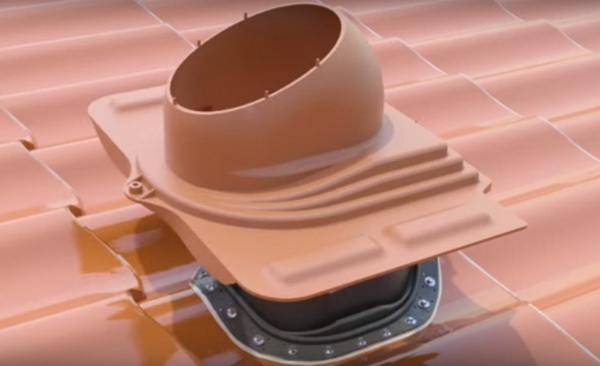 Selon les exigences des normes, le passage par le toit pour la ventilation est effectué de manière à ne pas réduire le niveau d'étanchéité du revêtement existant et à empêcher l'humidité de pénétrer dans le bâtiment. Il ne doit pas non plus interférer avec le ruissellement naturel des précipitations et doit avoir une protection d'isolation thermique fiable. Dans la partie supérieure, la cheminée est fermée par une visière spéciale (déflecteur), qui la protège de la pénétration d'humidité.