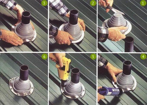 Lors de l'aménagement de l'UE, l'attention est attirée sur deux méthodes d'installation, qui diffèrent par le type de toit - dur et souple. Dans le premier cas, les éléments structurels sont montés sur une toiture en tuiles, en ardoise ou en carton ondulé. Pour leur installation, un siège carré est préparé, dont les fentes sont remplies d'un composé isolant thermique. Une bride est faite au-dessus, ce qui protège l'isolation thermique de l'humidité qui s'est accidentellement infiltrée dans le trou du tuyau. Quatre éléments de tablier sont montés autour du manchon, couvrant les zones où le tuyau rencontre le toit de tous les côtés.