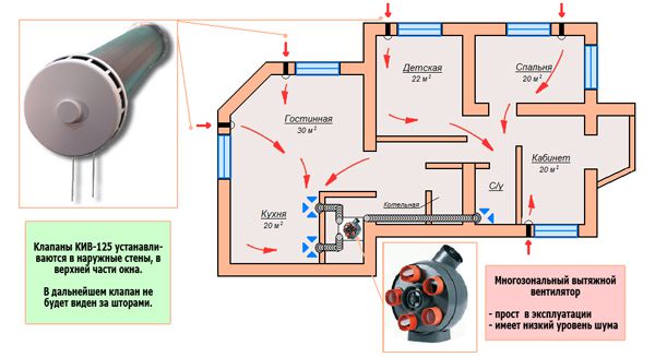 En règle générale, l'afflux est assuré par les mêmes vannes. Mais la sortie d'air s'effectue de manière forcée. Lors du choix des ventilateurs, il convient de prendre en compte non seulement la puissance, mais également les performances sonores. Après tout, si dans une ville bruyante, 20 décibels sont complètement invisibles pour les résidents, dans la nature, ils peuvent créer des inconvénients.