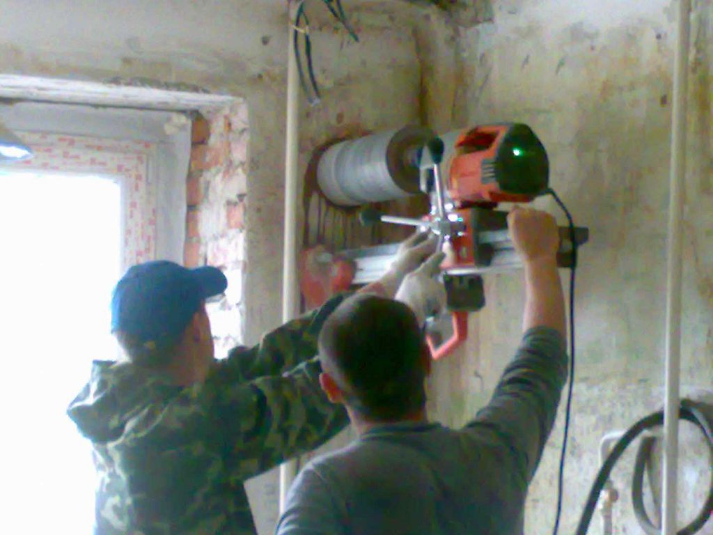 - Initialement, un trou doit être fait dans le mur. Son diamètre doit être de 7 centimètres. Un morceau de tuyau le long de la largeur du mur devra être calculé en tenant compte du fait qu'il ne doit pas dépasser du côté opposé de plus de 1 centimètre. Le trou doit être percé en biais.