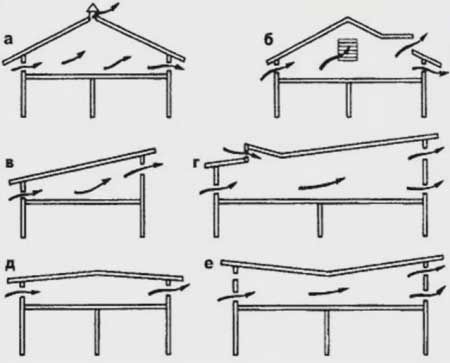 Lors de l'équipement d'une ventilation de grenier de vos propres mains, l'emplacement des bouches d'aération dépend en grande partie de la forme du toit. Diverses options sont suggérées dans le schéma ci-dessus.