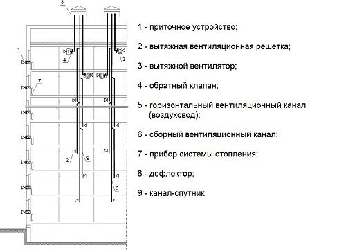 Selon le code du bâtiment, la ventilation dans un immeuble à plusieurs étages s'effectue selon le schéma suivant: l'air pénètre par les fenêtres légèrement ouvertes des locaux d'habitation, qui est aspiré par la ventilation des salles de bains ou des cuisines.