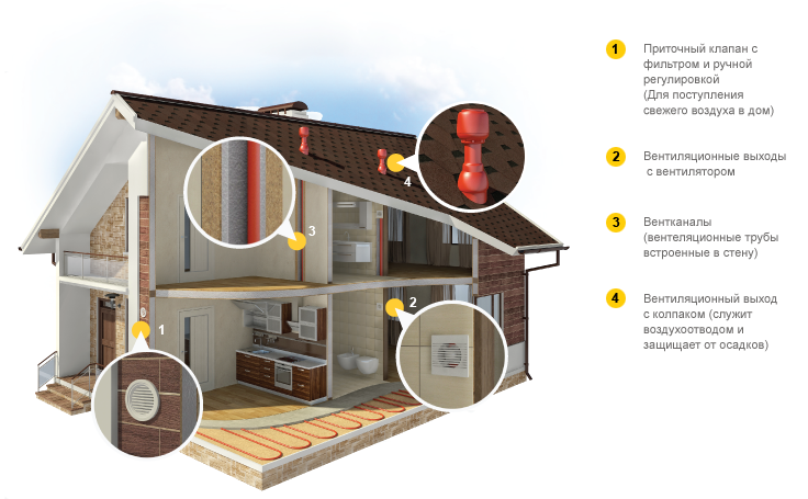 Avec une hotte d'extraction de haute qualité, l'arrivée peut être organisée par micro-ventilation par des fenêtres ou des vannes d'alimentation. Cette méthode réduit légèrement l'efficacité énergétique du bâtiment. Par conséquent, dans de telles maisons, des unités d'alimentation en air de ventilation à air chaud sont utilisées, qui sont difficiles à assembler de leurs propres mains.