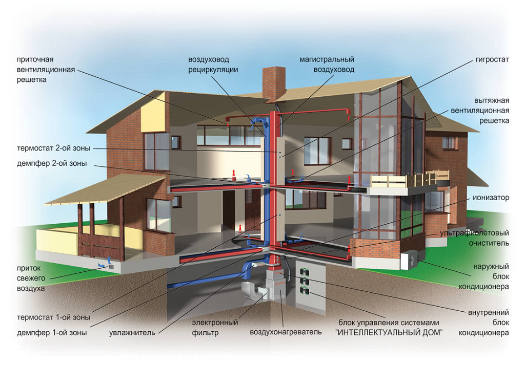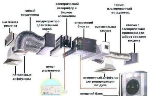 Le schéma standard de ventilation forcée consiste en un apport mécanique d'air de la rue, qui est filtré, porté à la température requise et acheminé au sous-sol. En même temps, l'air évacué est aspiré par les conduits d'évacuation dans la rue.