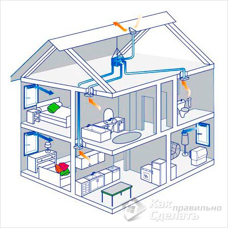 - la deuxième option consiste à fabriquer une hotte à part entière, qui est un canal de tuyaux tirés de chaque pièce. Dans le grenier, dans ce cas, vous devez soit conclure sous la forme d'une colonne compacte, qui s'élève au-dessus du niveau du toit (semblable à la ventilation des maisons à panneaux), soit combiner tous les canaux en un seul et créer un système de circulation forcée à l'aide d'un souffleur. Avec ce schéma, les canaux partant de la salle de bain et de la cuisine sont également équipés de clapets anti-retour.
