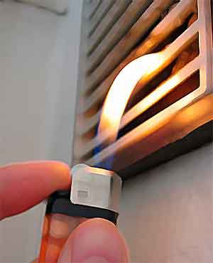 - Allumez une allumette et amenez-la sur la grille. Si la flamme pénètre dans le conduit de ventilation, alors tout est en ordre avec la ventilation de la cuisine. Vérification de la ventilation dans la cuisine sur la photo. Lorsque la languette est tenue verticalement, la ventilation de la cuisine ne fonctionne pas. Et si la flamme se penche dans la cuisine, il y a un tirage inversé dans le système de ventilation.Cette méthode n'est jamais utilisée par les professionnels, car des gaz inflammables peuvent s'accumuler dans les conduits de ventilation.
