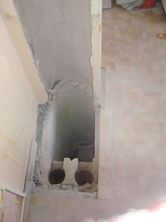 - Le tuyau est inséré dans le trou de ventilation de la cuisine. Les fissures entre elle et le mur moussent ;