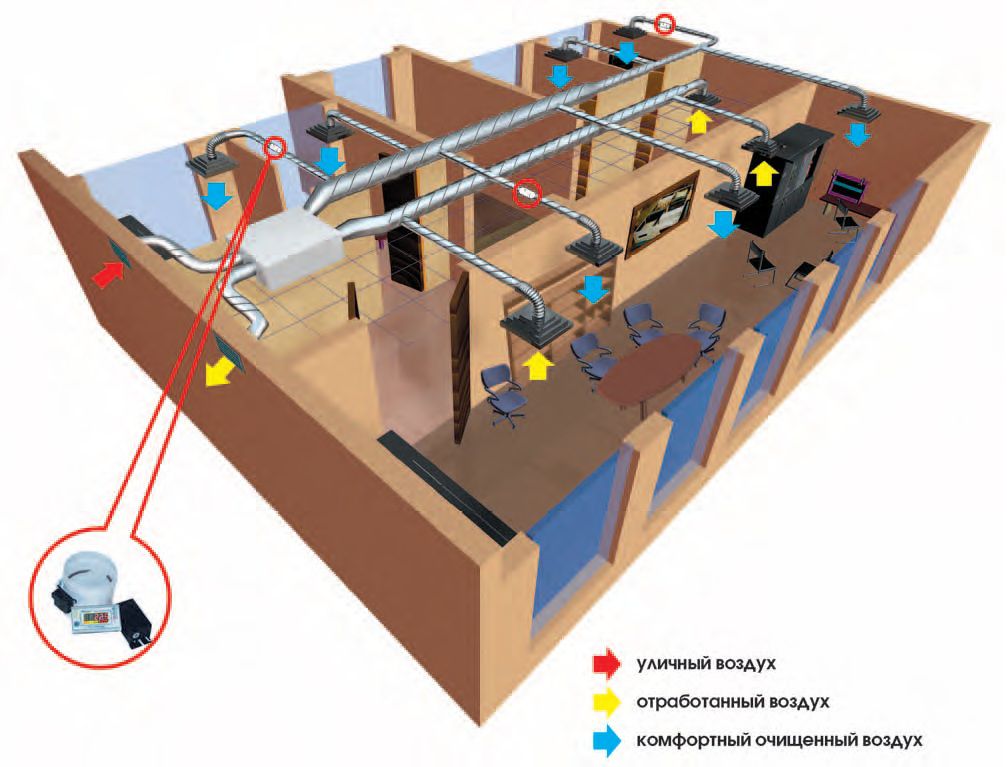 Le principe de fonctionnement de la ventilation de soufflage et d'extraction est simple et efficace. L'air évacué est aspiré de l'appartement, saturé de vapeurs, de poussière, de substances cancérigènes, d'odeurs désagréables et d'allergènes. En même temps, l'air extérieur est fourni, purifié de tous les dangers possibles et porté à une température agréable.
