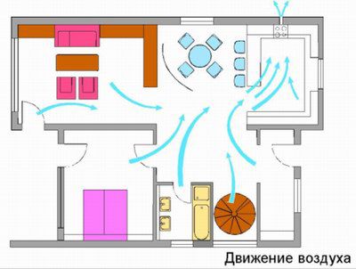 Lors de la planification d'un système de ventilation dans un appartement, il est important de répartir correctement le mouvement des flux d'air. De l'air pur doit être fourni aux pièces à vivre, circulant dans les couloirs vers la cuisine, les toilettes et la salle de bain. De là, l'air évacué est évacué par les grilles de ventilation. Un tel modèle de mouvement de l'air fournit une pression accrue dans les pièces "propres" et le déplacement de l'air évacué de celles-ci empêche l'air d'être aspiré des toilettes ou de la cuisine dans les pièces à vivre.