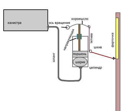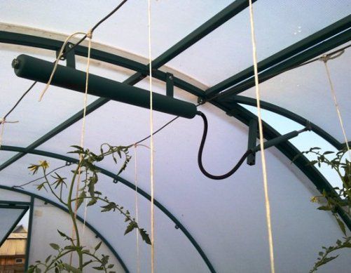 Un tel système de ventilation de bricolage fonctionne assez simplement. L'air dans le récepteur, fixé sous le plafond de la serre, lorsqu'il est chauffé, se déplace dans le cylindre, ce qui contribue au gonflage du ballon. En même temps, le piston avec la tige monte, agissant sur le culbuteur, tirant la ligne et soulevant la vitre. Lorsque l'air se refroidit, la fenêtre se ferme.