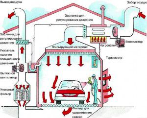 Le calcul de la ventilation dans la cabine de peinture est assez difficile, car un mouvement d'air trop important peut perturber le processus technologique. L'insuffisance met en danger la santé du personnel. Les débits d'air lors du calcul de la ventilation d'alimentation et d'extraction de la cabine de pulvérisation sont calculés par un professionnel. La filtration de l'air rejeté à l'extérieur est obligatoire.