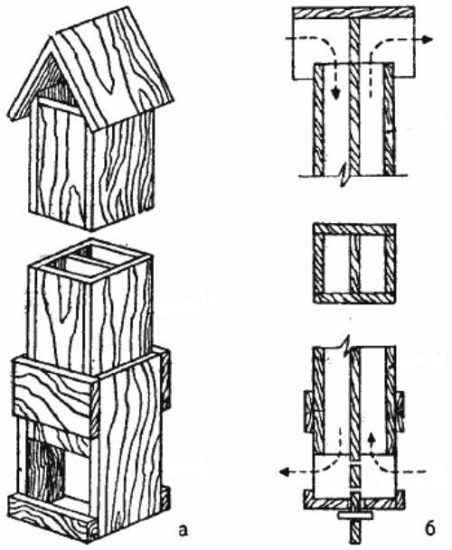 Schéma de ventilation pour poulailler n°3. Ce dispositif original de ventilation de poulailler est basé sur l'utilisation de l'énergie éolienne. Il convient aux pièces ne dépassant pas 8 mètres carrés. zone de mètres. Un canal vertical de section carrée de 20x20 cm est en cours de construction à partir de planches. A l'intérieur, le canal est divisé en deux parties sur toute sa longueur. La sortie supérieure du canal est fermée, ses parois extérieures sont enduites de mastic et peintes. Des trous sont percés dans les parois latérales.