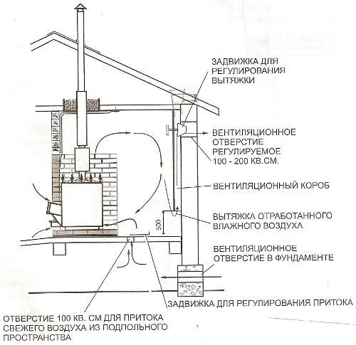 Il est impossible de régler l'intensité de la ventilation dans une telle pièce : en cas de vent fort, il peut y avoir un courant d'air, et une température suffisante ne peut être maintenue. Un photo-schéma de la ventilation naturelle dans le sauna est joint.