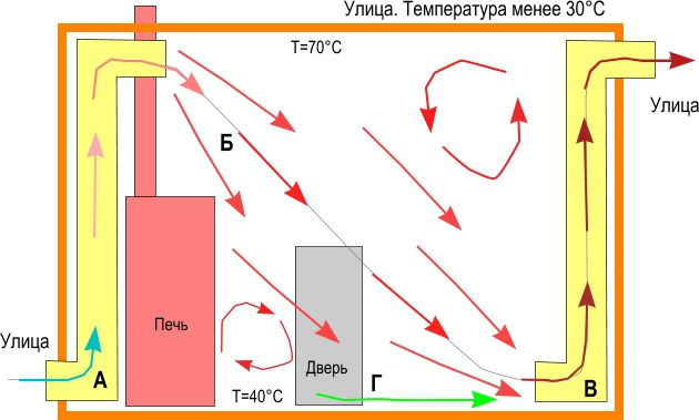 L'entrée est installée directement derrière le foyer, à 0,2 m au-dessus du sol. L'échappement est prévu sur le mur opposé, à la même hauteur. L'air de la rue traverse le poêle chaud, monte au plafond. Lorsque la température diminue, le débit d'air diminue et atteint l'évent d'échappement.