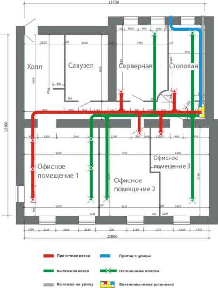 L'entrée d'air de la rue avec ventilation d'alimentation du bureau s'effectue à une hauteur de deux mètres au-dessus de la surface du sol. L'air est passé à travers le système de nettoyage, si nécessaire, sa température est réduite ou augmentée (électrique ou chauffe-eau).