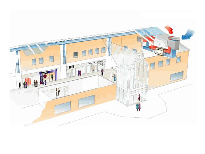 Pour la ventilation du centre commercial, des systèmes de recirculation peuvent être utilisés, mais les pièces contenant des substances toxiques, dangereuses, explosives et inflammables, ainsi que des marchandises à forte odeur, ne doivent pas y être connectées. Le système de ventilation amène ici l'air de la rue.