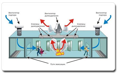 Il est nécessaire d'organiser le désenfumage de manière à ce qu'en cas d'incendie inattendu, la fumée soit tout d'abord évacuée des pièces et zones de la maison par lesquelles les résidents en seront évacués - escaliers et plates-formes, couloirs, cages d'ascenseur.