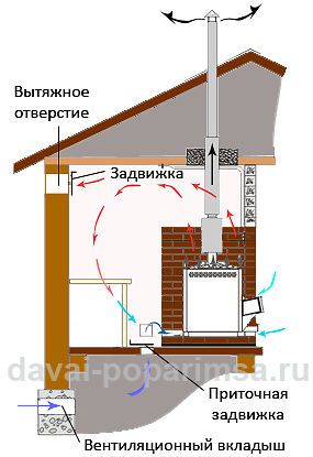 Pour assurer la circulation de l'air propre dans la cabine, un petit trou est pratiqué sur le mur opposé (de celui où la cheminée a été insérée). Il ne doit pas être à plus de 0,2 m du sol et recouvert de grilles de ventilation décoratives.