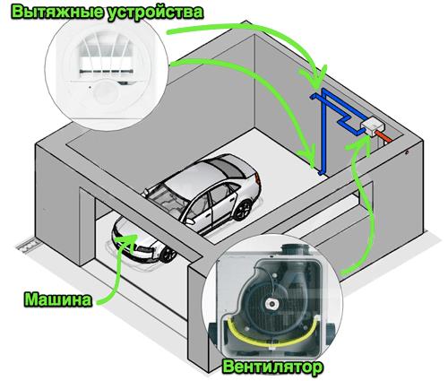 Les systèmes de ventilation forcée ont des ventilateurs de soufflage et d'extraction. L'air frais passe par un filtre à impuretés mécanique et est chauffé en hiver par un radiateur électrique ou un radiateur connecté au système de chauffage. Les systèmes de ventilation forcée sont utilisés dans les garages avec de grands volumes de locaux, ainsi que dans les garages chauffés. Le système de ventilation justifie sa création en prolongeant la durée de vie de la voiture et en offrant des conditions de confort et de sécurité à une personne.