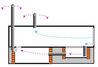 Dans la plupart des cas, les systèmes de ventilation suivants sont utilisés : naturel, forcé, combiné (mixte). Le plus simple est le système de ventilation naturelle. Le tirage est créé en raison de la différence de hauteur des ouvertures d'alimentation et d'évacuation, il fonctionne comme un poêle ordinaire. Un flux d'air continu est créé de l'admission à l'échappement. La création d'un tel système nécessite des coûts minimes.