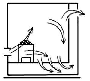 Vous trouverez ci-dessous un diagramme par lequel l'air se déplace dans le bain lorsqu'il entre de l'extérieur et sort par les conduits ou les ouvertures d'échappement.