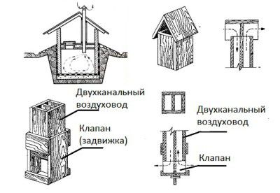 Auparavant, dans les villages, de manière simple, ils décidaient de la manière d'aménager la ventilation au sous-sol. Une caisse en bois faite de planches servait à rafraîchir l'air dans les caves. Pour économiser les matériaux, il était souvent fabriqué à deux canaux, combinant alimentation et échappement.