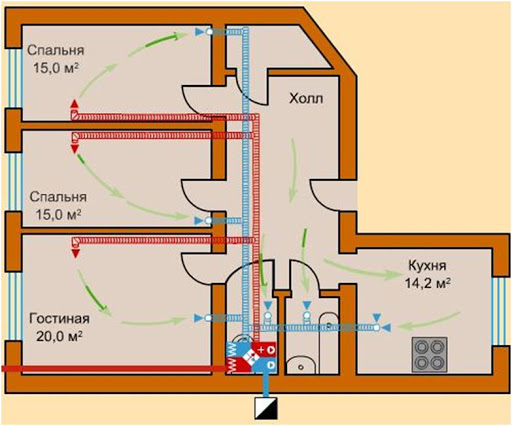 Dans ce schéma, l'alimentation en air forcé est combinée avec des dispositifs d'échappement. A cette dernière fin, des vannes ou des appareils électriques spéciaux peuvent fonctionner. Avec la sélection correcte des paramètres, la conception vous permet d'équilibrer la circulation (flux d'air entrant et sortant) et d'obtenir un microclimat optimal dans chacun des locaux de l'habitation. La récupération minimise le retour de la chaleur domestique vers l'environnement extérieur en hiver. Les points faibles de cette solution sont le coût élevé des appareils, ainsi que le coût d'installation d'un faux plafond.