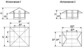 Les parapluies rectangulaires pour la ventilation sont fabriqués en tôle d'acier d'une épaisseur de 0,55 à 1 mm selon TU. Le rapport hauteur/largeur peut être sélectionné en fonction du projet minier, mais en tenant compte du GOST pour les parapluies du système de ventilation. La sortie de la hotte rectangulaire peut également être recouverte d'un grillage.