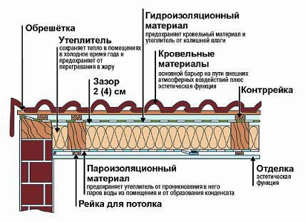 L'imperméabilisation ne permet pas la précipitation dans la couche isolante. Le matériau d'imperméabilisation optimal est constitué de membranes respirantes à super diffusion. Ils laissent passer la vapeur des pièces d'habitation, mais retiennent l'humidité par le haut. Posez l'imperméabilisant sur l'isolant. La photo montre un schéma de ventilation du toit au moyen d'un gâteau de toiture correctement posé.