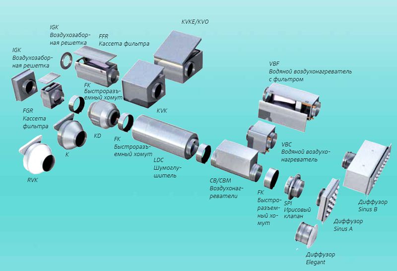 Lors de l'assemblage des systèmes de ventilation, des composants supplémentaires sont également utilisés : récupérateurs, humidificateurs, grilles de transfert, refroidisseurs et déshumidificateurs.