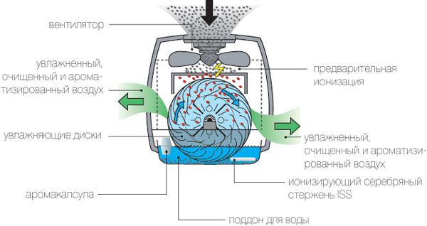 L'une des variétés de la technologie poreuse est la soi-disant "épuration de l'air". Dans ce cas, le ventilateur souffle de l'air non pas à travers les cartouches d'humidification, mais sur les disques hydrophiles placés sur un tambour spécial qui tourne le long d'un axe horizontal. Lors de la rotation, les disques sont immergés dans un réservoir d'eau, qui est ensuite évaporée sous la pression du flux du ventilateur. Equipé d'une décharge électrique, il assurera à la fois la fonction d'épuration des masses d'air et de leur enrichissement en ions.