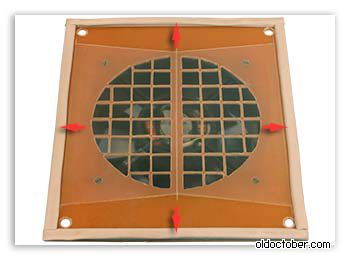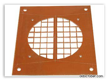 Pour la base du clapet anti-retour pour la ventilation de la cuisine, du plastique épais ou du textolite convient. Vous aurez besoin d'une plaque chevauchant la sortie du conduit d'évacuation et d'une épaisseur maximale de 4 mm. Des marquages sont faits sur la plaque : une grille de la taille d'un trou de ventilateur, ainsi que des trous pour la fixation au mur (dans les coins) et pour la fixation du ventilateur.
