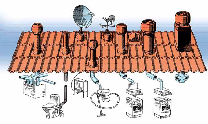 - Diamètre de la sortie de ventilation avec une hotte. Il est directement proportionnel à la surface du toit. Pour économiser de l'argent, sur les toits de formes complexes avec un grand nombre de greniers, les sorties de ventilation vers le toit sont constituées de tuyaux du plus petit diamètre;