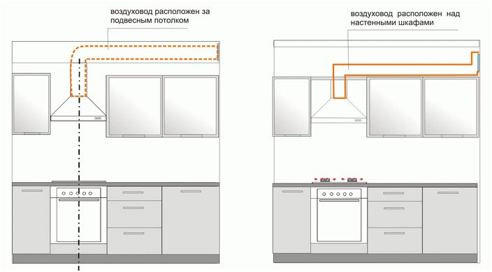 Le conduit d'air menant à la ventilation de la cuisine à partir de la hotte doit être installé de manière à assurer le libre passage de l'air, de la vapeur et de la suie. Le nombre de ses tours, ainsi que la longueur, doivent être petits, car chaque virage consomme jusqu'à 10% de la puissance de l'appareil. De l'air frais doit être fourni en permanence dans la zone de la cuisine, une ventilation régulière est donc nécessaire pour que la hotte fonctionne correctement.
