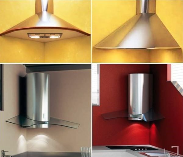 La plupart des modèles modernes de hottes d'angle sont conçus dans une version combinée et combinent les possibilités d'installation selon n'importe quel principe.