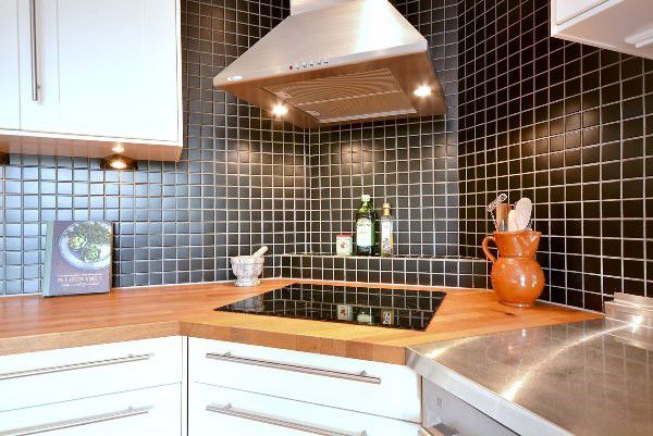 Mais il n'y a pas que l'envie d'épargner qui tient à ce choix. La conception du coin cuisine avec une hotte originale et une cuisinière dans le coin est également choisie par les propriétaires de grandes cuisines. Premièrement, cette disposition est pratique : il y a des surfaces de travail des deux côtés à la fois ; d'autre part, il est original et contribue à créer une atmosphère chaleureuse. Comme sur cette photo par exemple.